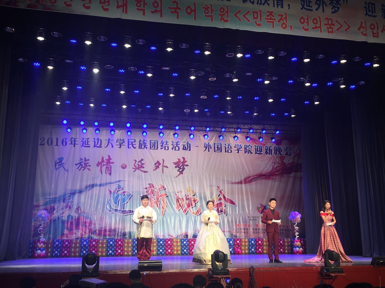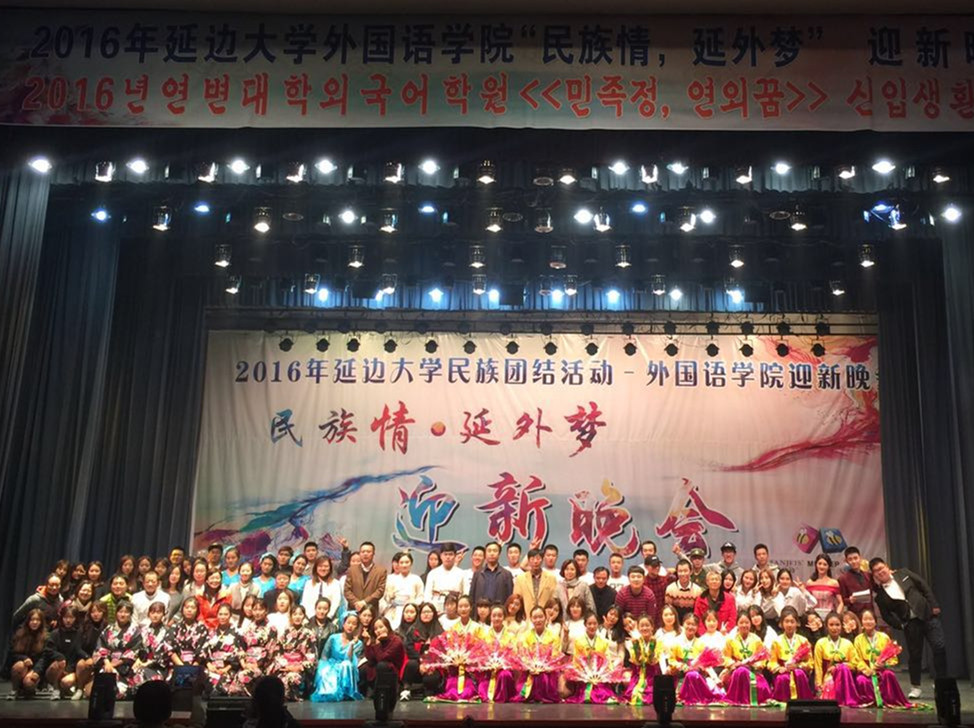 俱乐部举办民族团结月活动之“民族情,延外梦”2016级迎新生晚会。学院党委赵亮书记、学院郑鲜日院长、学院全永男副院长、学院崔雪波副院长、关心下一代委员会刘文主任、学院办公室李光赫主任、学生工作办公室裴香花主任、学院团委金春宪书记,各专业书记主任、辅导员、班主任及任课老师出席本次晚会。