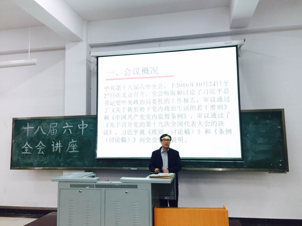 任教授首先介绍了党的十八届六中全会的概况,总结了本次会议与历次的不同点,全方位地阐释了党的十八届六中全会的重要意义。任教授指出深入学习和宣传党的十八届六中全会精神,是学校当前和今后一个时期的重要政治任务,对学校深化改革,加快大学建设步伐具有重要的理论和实践意义。随后,任教授以党的十八届六中全会的聚焦基础——坚定理想信念为主要内容阐释了如何做一名合格大学生,他将实现理想的途径和条件与外语学习相结合,鼓励大家要有坚强的信念,要立足本职、从小做起,从现在做起。最后,金书记为本次讲座做了总结,他希望同学们能够认真领会党的十八届六中全会精神,做一名有思想有理想的大学生。