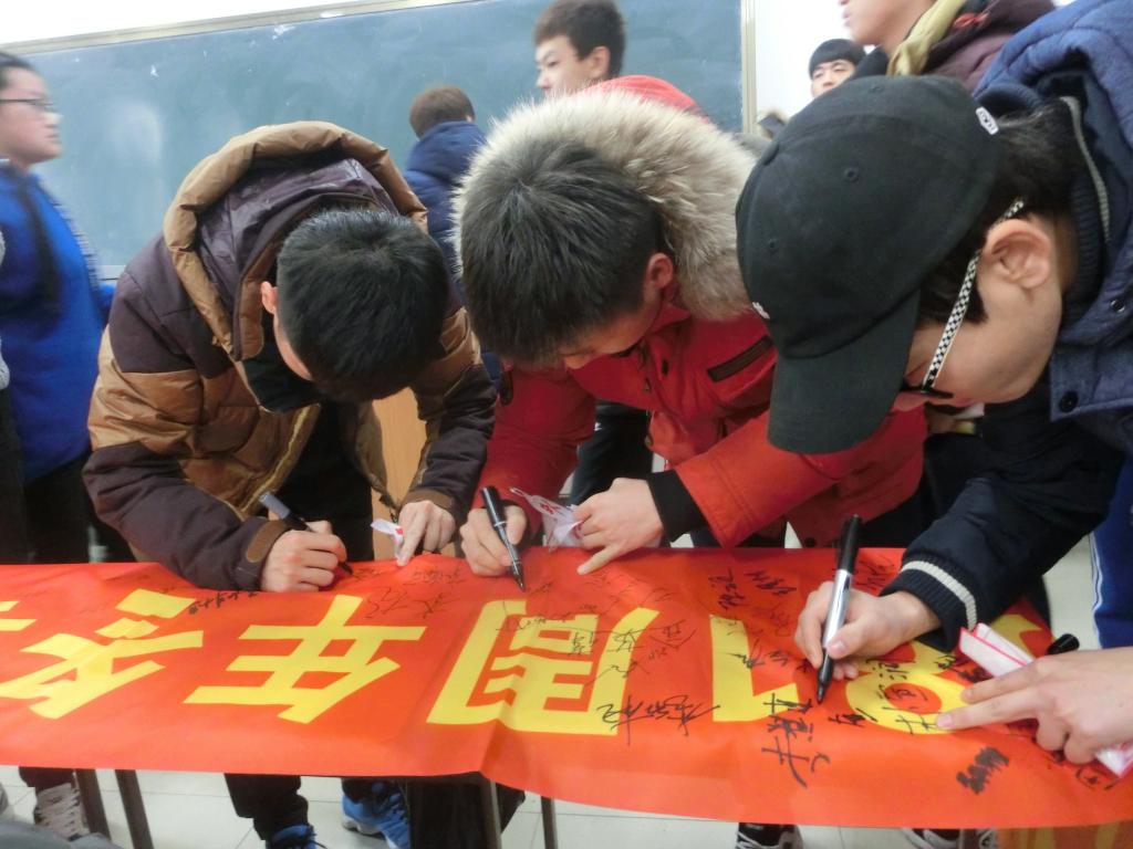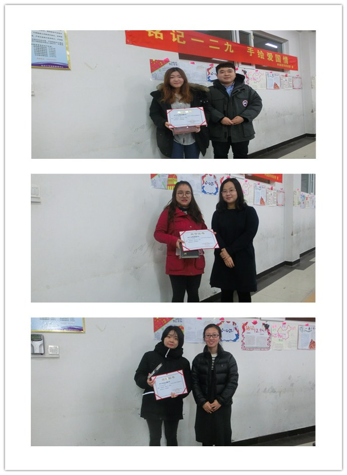 首先进行的是"铭记一二·九,手绘爱国情"手抄报比赛,同学们的作品充分表达了当代青年的爱国热忱,在老师们的精彩点评下,最终由2016级英语专业林利花同学获得本次大赛的一等奖,2015级英语专业李美贤同学获得本次大赛的二等奖,2015级日语余红英同学获得本次大赛的三等奖,另外,2016级英语专业朴宣润同学以及2015级俄语专业李侄香同学获得本次大赛的优秀奖,颁奖仪式结束后,全体参加人员在宣传横幅上进行签字纪念。