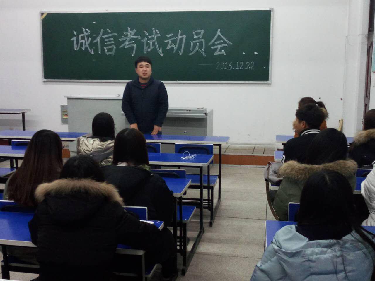 各专业在辅导员金春宪老师、郭鲜丹老师、严文颖老师的带领下召开了诚信考试动员大会。各专业学生会全体成员以及各班班长,副班长,团支书,学习委员,参加了本次会议。