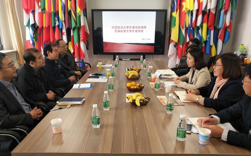 在对外经济贸易大学调研期间,受到了对外经贸大学原校长陈准民、英语学院分党委书记(负责学院党政全面工作)张翠萍、外语学院院长徐永彬、院领导班子成员、以及相关部门负责人的热情欢迎。学院负责人介绍了“双一流”和“一带一路”倡议下的“外语+商务”复合型、创新型、精英型人才培养模式、通识教育课程建设、跨学院合作项目、“国际本土化”和“国际写作中心”网络平台建设等情况。同时分享了“三语实验班”和“国际基地班”的办学经验。
