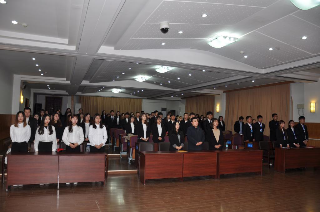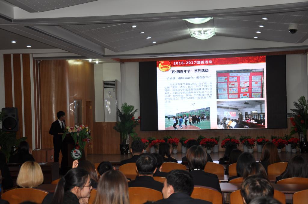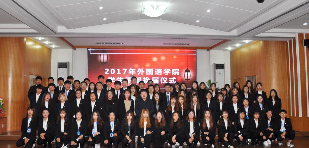 2017年学生干部换届仪式在综合楼七楼报告厅顺利举行。学院学生工作办公室主任金春宪老师、团委书记郭鲜丹老师以及俄语专业辅导员周沫老师出席了本次大会。