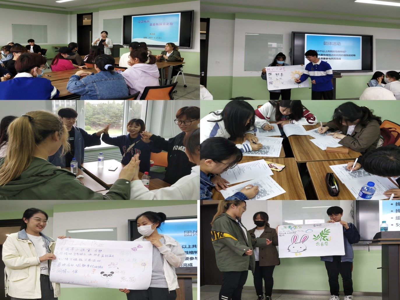 本次活动由李老师带领着同学们进行EGO-GRAM性格测试,以小游戏“按节奏集体拍手说词”作为开始以更好地活跃活动的气氛,调动学生们的积极性,随后每位同学做了一份关于性格的测试题,根据学生们的不同选择分为四个小组,而后每个小组由组长带领组员们一起在纸上写出他们的某些共同特点,从而更好地了解自己,了解其他小组同学,提高同学们之间的亲密度。