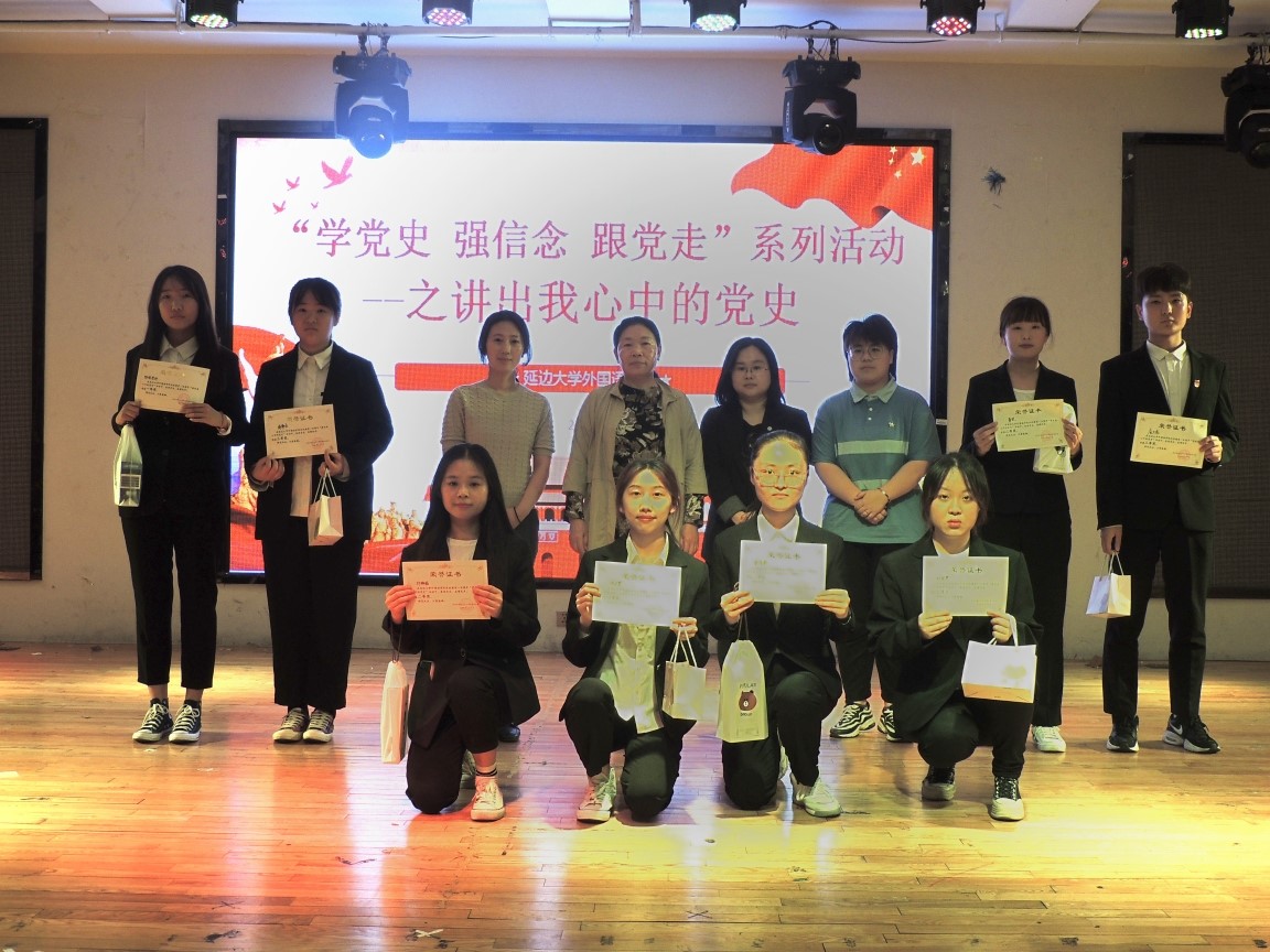此次活动,八名参赛选手以“学习百年党史,传承红色基因”为主题,回顾了中国共产党在各个时期的重要历史事件,致敬了为革命胜利奋斗的先贤们,带领大家抚今思昔、温故知新,重温了我们党的一百年来的风雨历程。经过评委评分和工作人员的统计后,陈俊思圻同学获得一等奖,刘梓茹、郭金艳、郭欣三位同学获得二等奖,朴芝慧、缪静雨等四位同学获得三等奖。随后,老师们为获奖同学颁发证书及奖品,并合影留念。