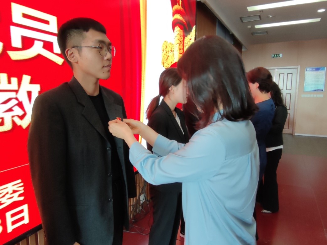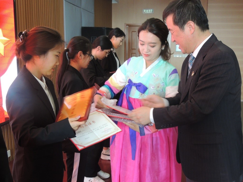 分党校优秀学员以及“学党史、悟思想、办实事、开新局”庆祝建党100周年党史学习教育知识竞赛获奖人员的决定。随后,由全永男书记向学院分党校优秀学员颁发了奖牌和奖品,并由孙盛梅同学作为优秀学员获奖代表发言。接下来,由关心下一代委员会主任刘文、大学外语部党总支书记裴英玉、英语专业党总支书记金明浩分别为党史竞赛活动的第一名、第二名、第三名获奖人员颁发奖品。接下来,由李仁哲主任宣读了《批准中国共产党预备党员通知书》及参加入党宣誓的74名预备党员名单,所有预备党员由入党培养人为其佩戴党员徽章并在申文成同志的带领下向党旗庄严宣誓。紧接着,由预备党员代表郑胜利同志发言,她首先感谢学院对其的辛勤培养,并表示一定会更加努力提升自己,向着早日成为一名光荣的共产党员而努力。最后,由全永男书记作总结讲话,他对新一批的预备党员表示了鼓励,并希望他们能够不忘初心,继续砥砺前行,不懈奋斗,早日成为一名合格的党员。
