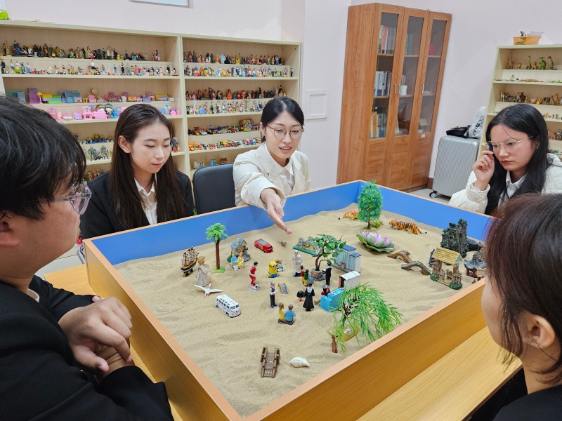活动开始,郑老师介绍了团体沙盘活动的由来,引导同学们交流摸沙的感受,讲解了课程的内容和开展方式。随后,郑老师让同学们按照抽签顺序依次在沙盘中摆放自己挑选的沙具。同学们轮流讲解自己的作品,表达自己摆放每个沙具的想法,交流对彼此沙具摆放的见解和感受。整个过程,全体参会成员积极参加,认真投入,一步步构建独特的沙盘世界,从不同的视角呈现自己对“学生干部团队建设”的理解和看法。每位同学都遨游在沙盘世界上,提出自己独到的见解,向其他同学分享着自己对“何为团队”这一主题的所思所想,在彼此的言论交织之间,大家的思想交汇,增强了对彼此之间的认识,拉近了心与心之间的距离。
