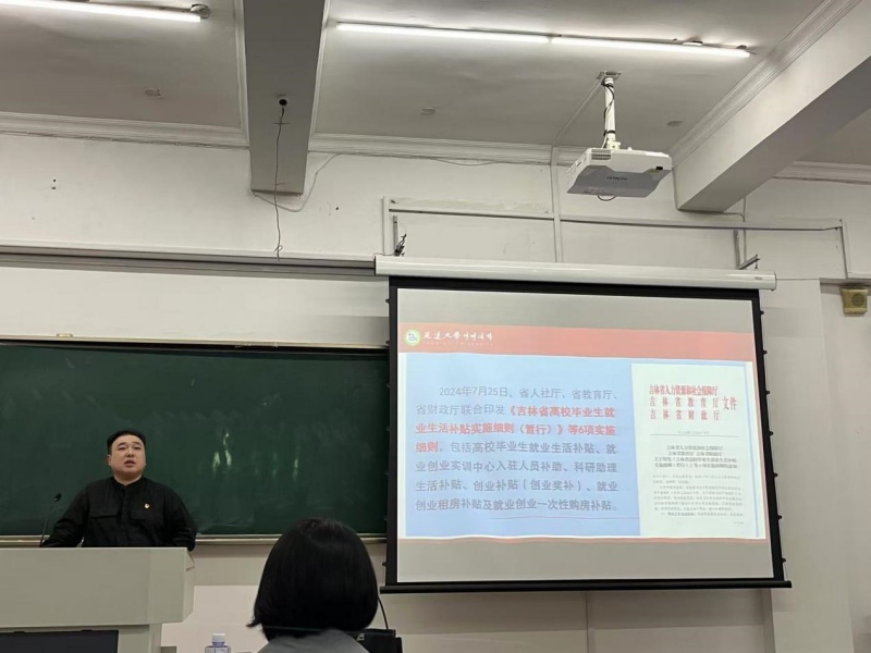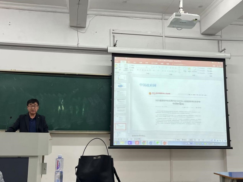 为扎实做好就业工作,此次招聘会前,英语专业党支部特召开2025届毕业生就业推进会,将党建引领与就业工作有机结合。英语专业党总支书记韩强对当前高校毕业生的就业形势进行了深入分析,指出在经济新常态下,就业市场正经历着前所未有的变化,这既带来了挑战,也孕育着新的机遇。他强调,同学们应积极适应市场变化,通过实习和实践活动提升自身竞争力,为未来的职业生涯打下坚实基础。英语专业学生党支部书记金春宪对当前高校毕业生的毕业去向进行了细致的分类说明,包括就业、创业、继续深造等多种路径。金老师通过分析2024届毕业生的就业情况和当前的就业形势,强调了“创业奋斗,‘就’在吉林”的创业就业工作会议精神,鼓励同学们抓住机遇,留在吉林发展,同时也为2025届毕业生指明了下一阶段的就业方向。