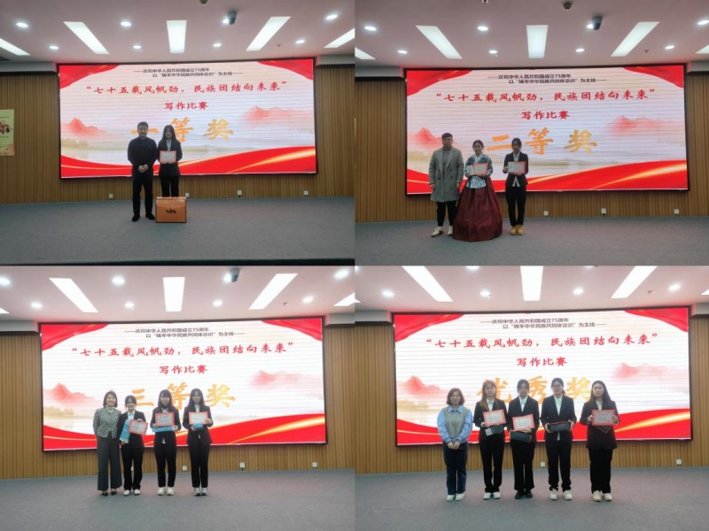 此次写作比赛分为朝鲜语赛道和汉语赛道,参赛选手们从“七十五载峥嵘路,龙章焕彩谱新篇”和“民族团结铸根魂,籽籽同心向未来”中选择一个主题进行现场写作。选手们以文字的形式回顾祖国的历史变迁和先辈们的艰苦奋斗,深入理解民族团结的重要性,将对祖国的深厚情感与美好祝愿融入文章之中。11月15日,朝鲜语专业团总支在科技图书馆802会议室举行颁奖仪式。