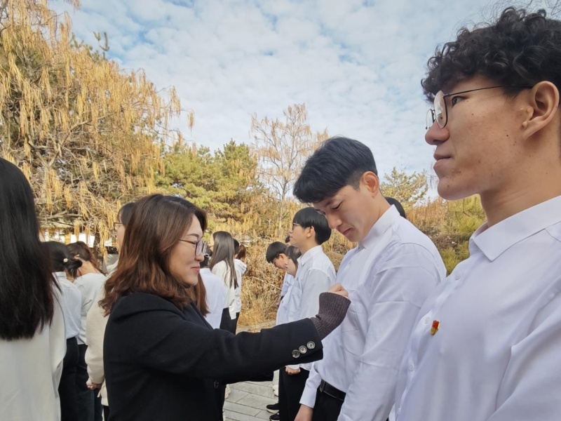 首先,同学们在朱德海铜像前举行新党员入党宣誓仪式。郑仁顺为新发展党员佩戴党员徽章并表示祝贺。新党员在领誓人的带领下宣读了入党誓词。新党员代表金艺林在发言中表示。活动最后,由郑仁顺作总结讲话。她强调,新党员同志们的加入,为党注入了新的血液和活力,希望大家能够时刻铭记自己的誓言和使命,积极投身于各项组织活动中,不断提高自己的党性修养和综合素质,同时更要严于律己,为民族的伟大复兴贡献自己的力量。