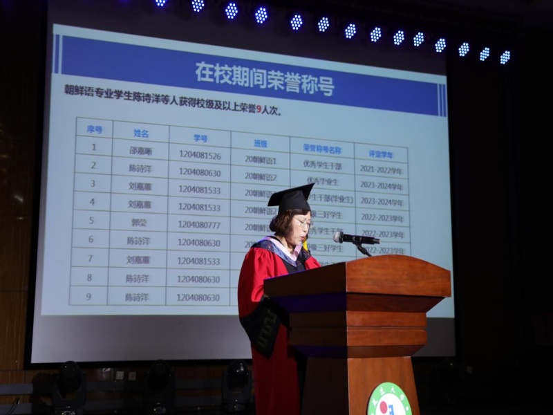 典礼最后,朴银姬致辞,她肯定了2024届毕业生在校期间对学院做出的贡献,并对毕业生们提出了殷切希望,一是要保持求知的初心,无论是继续深造还是在工作岗位上,都要铭记知识的重要性,不断提升自我;二是希望毕业生们在社会上努力拼搏奋斗,与此同时,还要多多关注社会上的困难群体,做一个有知识、有温度的新时代青年。