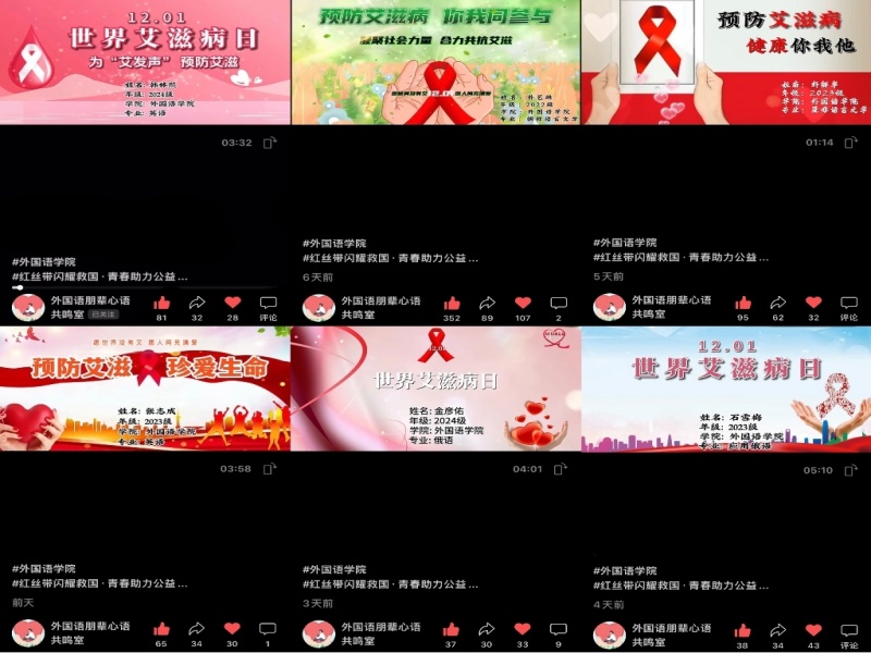 在整个比赛过程中,线上宣传发挥了重要作用。“外国语朋辈心语共鸣室”微信视频号定期推送活动进展情况和优秀作品展示,让更多同学了解并关注此次大赛。同学们积极准备作品,演讲组的选手们精心打磨演讲稿,用真挚的情感和生动的语言讲述一个个动人故事,将对艾滋病防治公益活动的深刻理解融入其中;微视视频组的同学则充分发挥创新思维,从拍摄到后期制作,围绕主题呈现出一部部精彩的作品,展现出艾滋病防治相关的公益行动和红丝带精神的内涵。