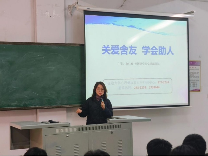 在勤学楼408教室开展“关爱舍友,学会助人”寝室长心理健康培训。学院党委副书记郑仁顺主讲,外国语学院100余名寝室长参加。