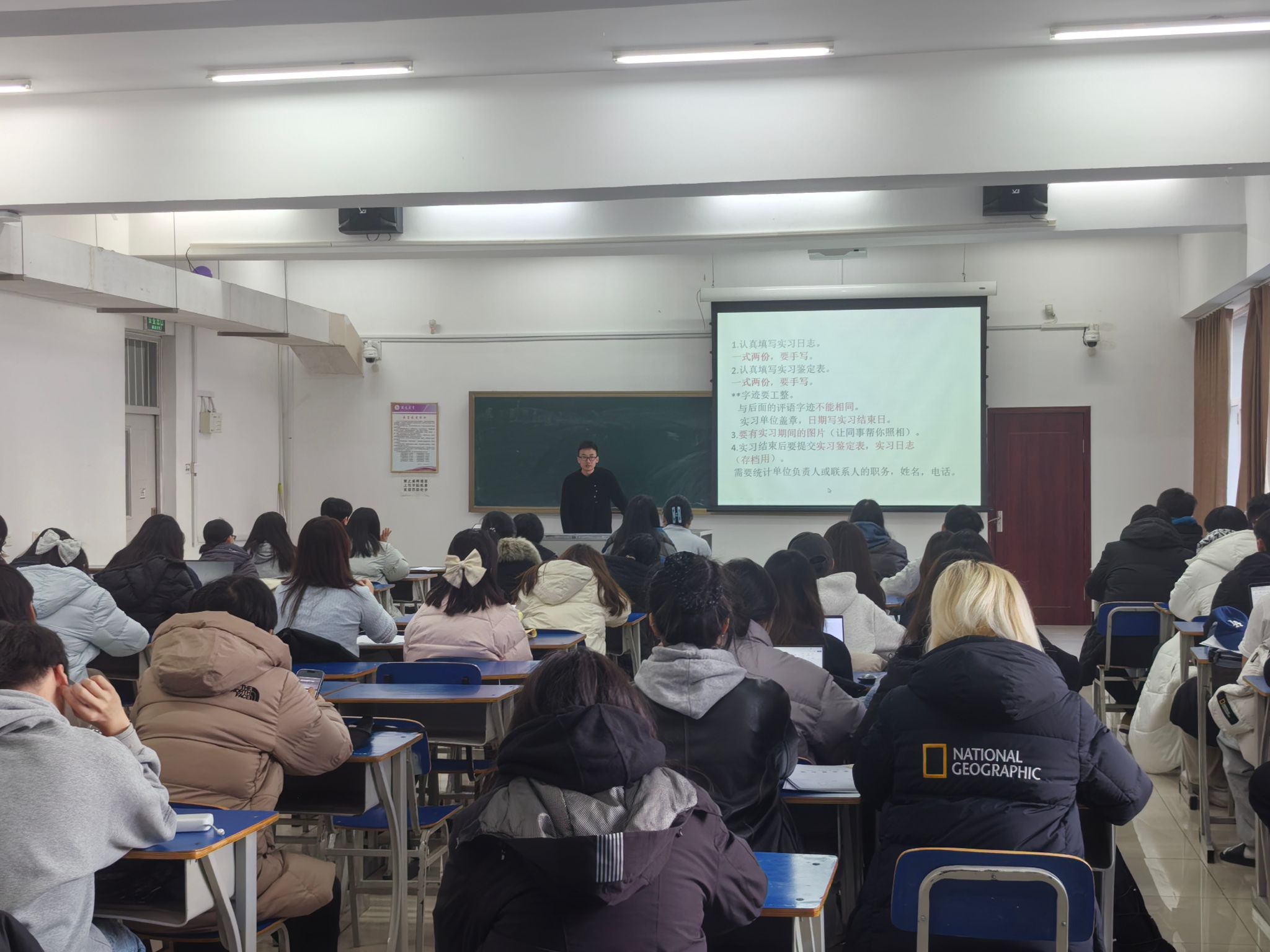 大会上,日语专业教师李文超从实习时间、实习内容等方面介绍了毕业实习的相关要求和注意事项,要求学生严格遵守学校规章制度和实习单位的管理规定,同时重点强调了校外实习安全注意事项,提醒学生提升安全防范意识,注意身体健康问题。日语专业辅导员郭鲜丹在会上要求学生端正实习态度,希望学生能够通过实习尽早明确自己的毕业去向,树立正确的就业择业观,同时强调了期末诚信考试的相关内容,提醒学生要遵守考场纪律,认真完成期末考试任务。