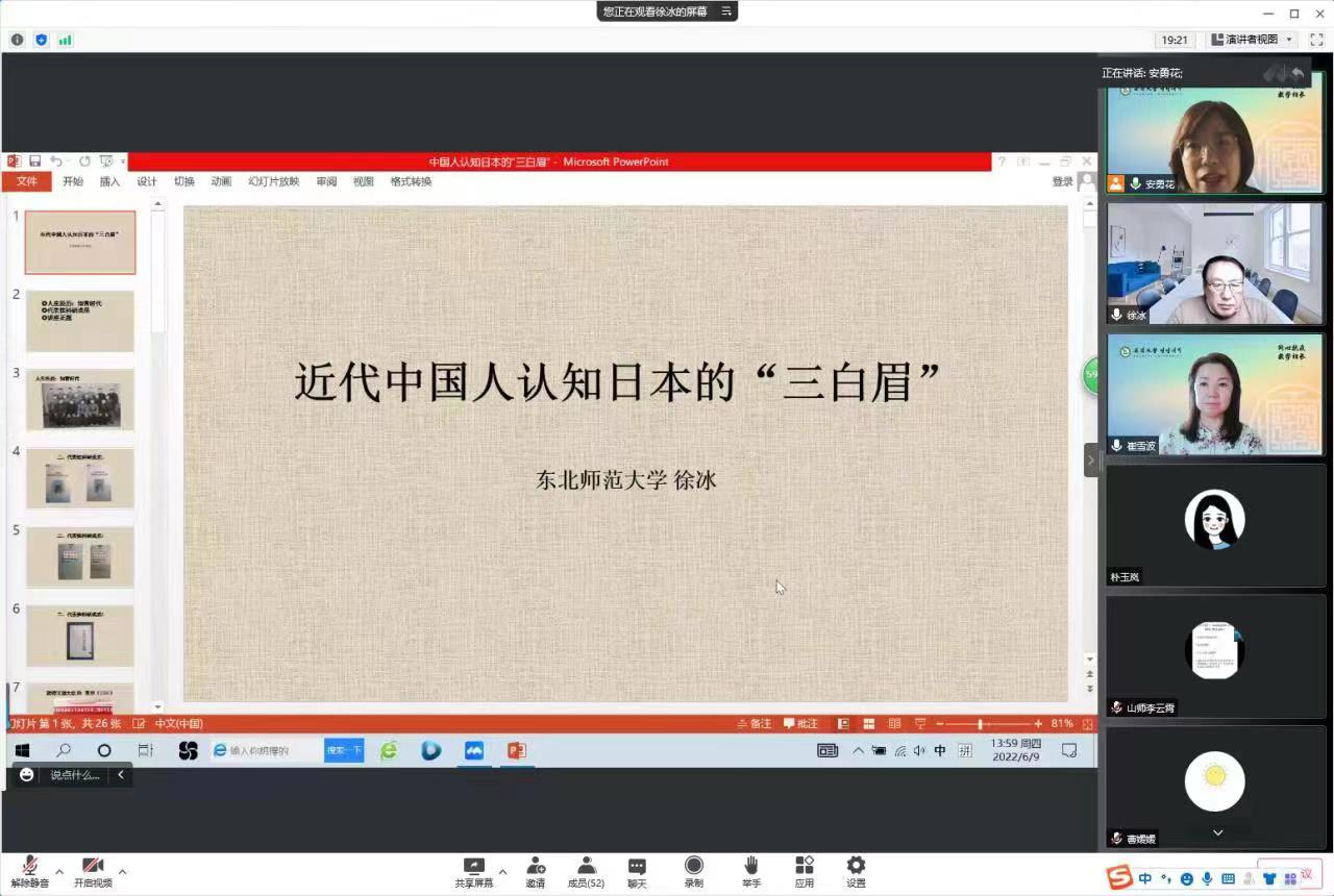 邀请东北师范大学日语系教授,博士研究生导师,兼任中国日语教学研究会副会长、中华日本学会常务理事、中国日本史学会常务理事、北京大学东北亚研究所客座研究员、吉林省外语学会副会长,徐冰教授作了题为《近代中国人认知日本的“三白眉”》的精彩讲座,会议由JKF 捷克论坛