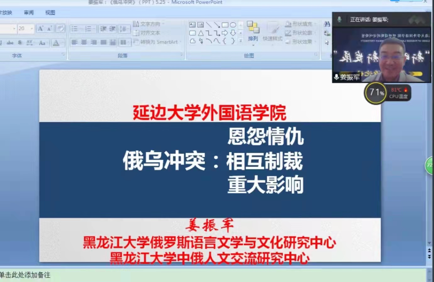 在线举办了“新时代·新发展”学科前沿论坛学术活动。黑龙江大学俄罗斯语言文学与文化研究中心副主任姜振军教授做了题为《俄乌冲突—恩怨情仇、相互制裁、重大影响》的主题讲座。学院院长崔雪波、副院长金明浩、俄语专业全体教师及相关学科师生参加了此次活动。活动由俄语专业主任李仁哲主持。